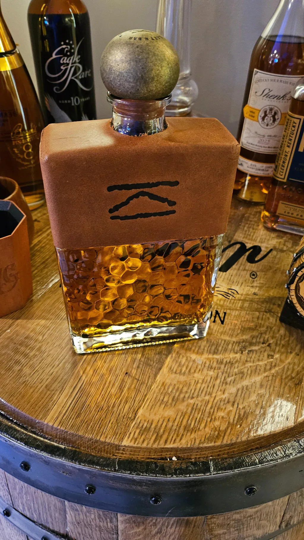 A blend of 8, 9, and 10 year old straight kentucky bourbon aged in #4 alligator char barrels and bottled in Montana. The masculine bottle reflects the rugged nature of the Lazy K Bar ranch itself. Shaped to fit in a saddle bag, the bottle is wrapped in real leather and branded with the cattle brand of Lazy K Bar.